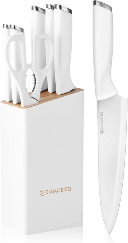 White Knife Set with Block, 7 Pieces Small Knife Block Set with Stainless Steel Blade Ergonomic Handle, Kitchen Knives Set Gifts for chef