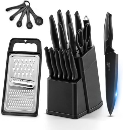 HaWare Knife Set, 21 Pieces Stainless Steel Kitchen Knife Block Set, Black Chef Knife Sets with 6 Steak Kinves, Measuring Spoon & Slicer for Home, Sharp Blade & Light Weight Cutlery, Ergonomic Handle