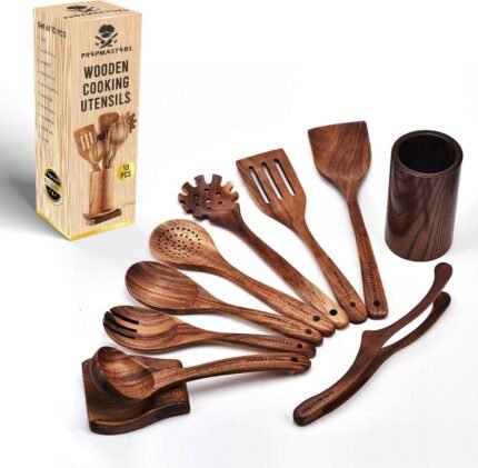 Price: (as of – Details) KAQISE 10-Piece Wooden Kitchen Utensils Set This 10-piece versatile set includes a variety of spoons