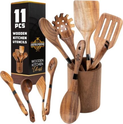 Armandine Teak Wooden Spoons for Cooking 11-Piece – Non-Stick & Non-Scratch Wooden Cooking Utensils Set – Heat Resistant Kitchen Utensils Set