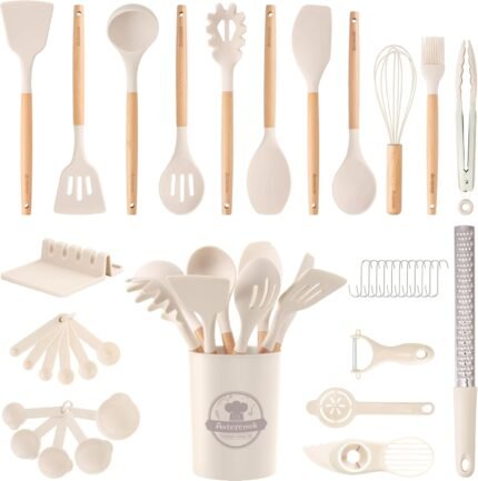 Astercook Silicone Cooking Utensils Set, 38 PCS Kitchen Utensils Set for 446°F Heat Resistant, Food Grade Utensil Sets with Wooden Handle, Kitchen Gadgets for Nonstick Cookware BPA Free (White)
