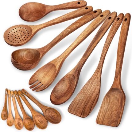 Bryantye 13-Piece Wooden Spoons for Cooking, Acacia Wooden Utensil Set with Measuring Spoons & Hanging Holes, Non-Stick Acacia Wooden Spoons with Spatula, Ladle, Spoon, Fork