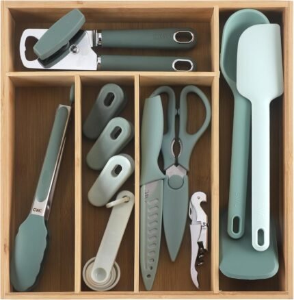 COOK WITH COLOR Bamboo Kitchen Utensil Set with Drawer Organizer | Cooking Tools and Storage Caddy, Sage, 18 Piece Gadget Set