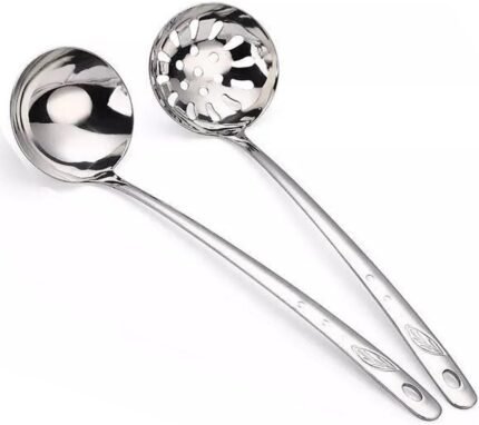 Cooking Ladles Soup Spoon, Serving Scoop And Ladle Strainer Set Stainless Steel Heavy Duty Soup Ladle Colander with Mirror Finish, Perfect for Hotpot Stirring, Deep Wide Enough 2PCS