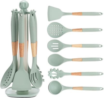 Cooking Kitchen Utensils Set, 7PCS Silicone Cooking Utensil Set with Rotating Holder, Heat Resistant Kitchen Essentials, Kitchen Gadgets for Cookware (Green)