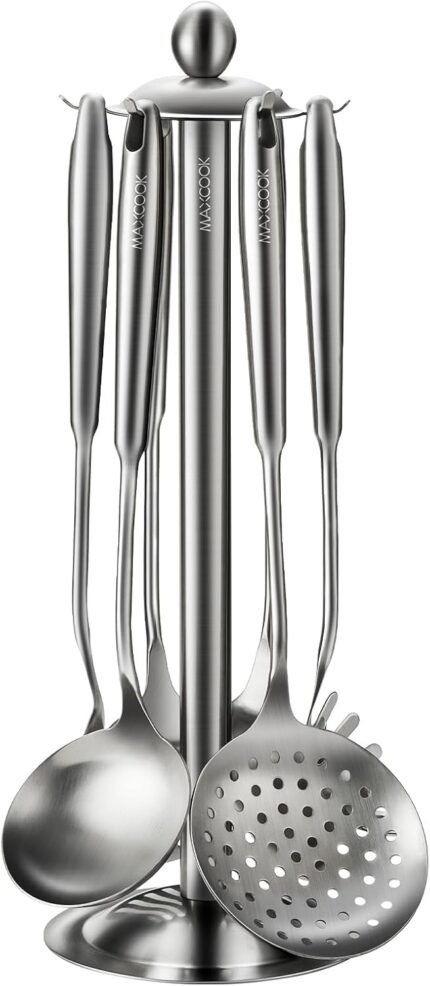 Cooking Utensils set, 18/8 Stainless Steel Kitchen Utensils set, 7 Pieces Cookware Set with Rotating Holder, Heat Resistant Stainless Steel Cooking Spoon(Dishwasher Safe)
