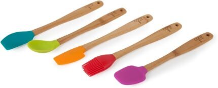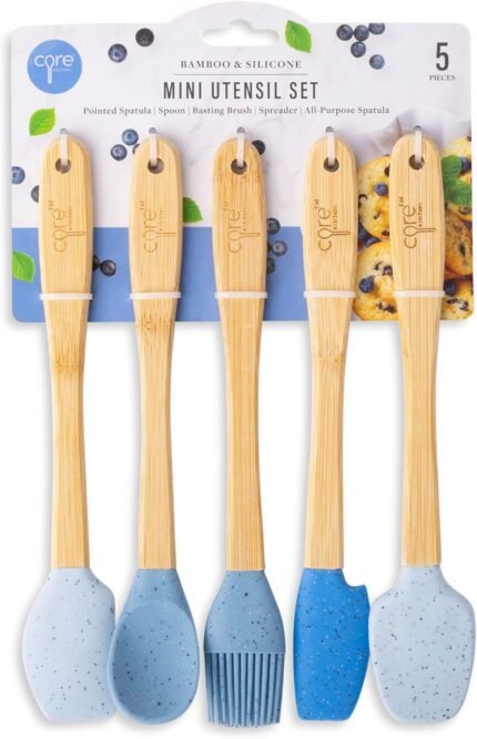 Core Kitchen 8.25″ 5-Piece Bamboo & Silicone Mini Utensil Set – Heat-Resistant Kitchen Tools – Speckle Pastel Sky, Levi Blue, Royal Ribbon