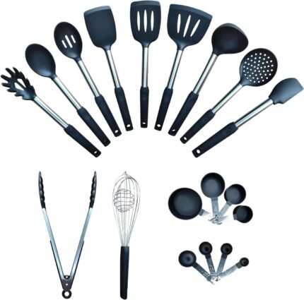 Herogo Silicone Cooking Utensils Set, 7-Piece Kitchen Utensils Set, Heat Resistant Cooking Gadget Tools Slotted Turner, Spoon, Soup Ladle, Pasta Server, Spatula, Tongs for Nonstick Cookware, Khaki
