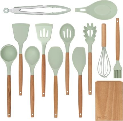 Lanzo Design Kitchen Utensil Set, 13 pcs Non-Stick Silicone Cooking Utensils Spatula Set with Wooden Holder (Mint)