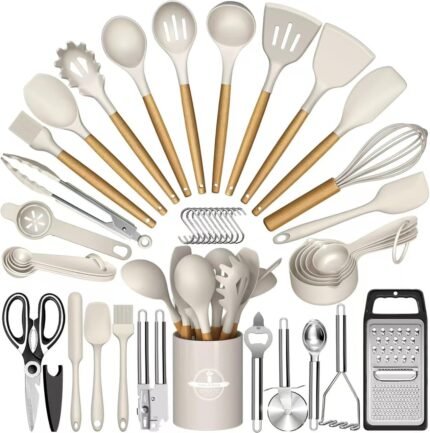 Kitchen Utensils Set,Vegoran 44PCS Silicone Cooking Utensils Set for Nonstick Cookware,446℉ Heat Resistance Silicone Spatulas Set, Wooden Handles Kitchen Gadgets Tools Set (Khaki)
