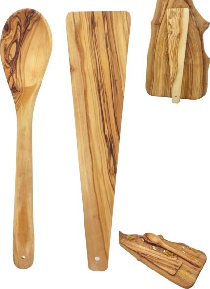 Olive Wood Cooking Spoon & Spatula | Wooden Utensils (12 Inch) | Gentle on non-stick cookware | heat-resistant | For Flipping, Turning and Serving in Everyday Cooking