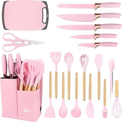 19 Piece Kitchenware Utensils and Knife Set- Includes: 9 Piece Silicone Cooking Utensils- 5 Piece Sharp Stainless Steel Chef Knives- Scissors -Whisk Tongs and Cutting Board (Pink)