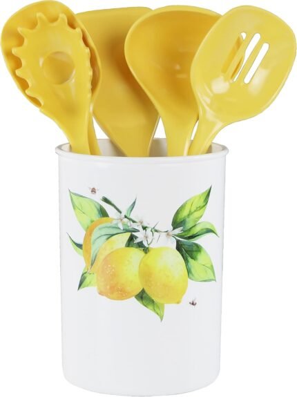 Reston Lloyd 6 Piece Kitchen Utensil Holder for kitchen counter, Utensils crock with Heat Resistant Spoon, Slotted Spoon, Ladle, Spatula BPA Free, Fresh Lemons