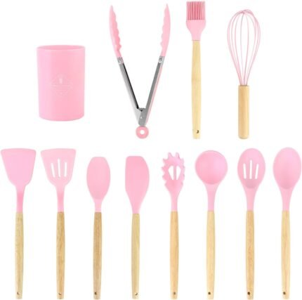 QWORK 12-Piece Pink Kitchen Tool Set – Includes Silicone Cooking Utensils, Whisk and Ladle, Tool Crock