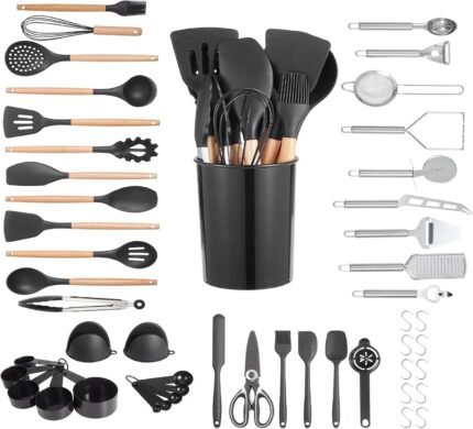 VEVOR Kitchen Cooking Utensils Set, 50 PCS Silicone Spatula Set with Holder, 428°F Heat Resistant Gadget Spoons Tools, Wooden Handle Home Essentials Accessories, Silicone Gadgets Cookware, Black