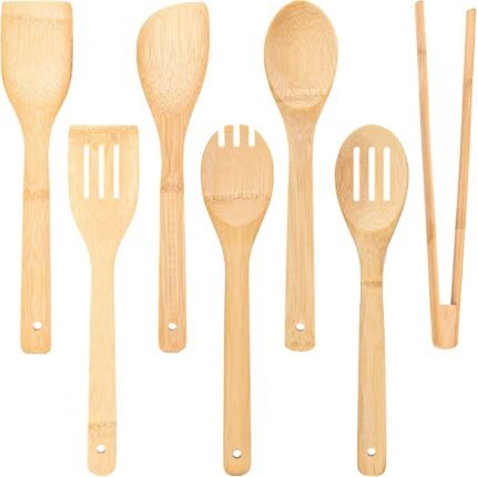 Wooden Utensils Set for Cooking, 7PCS Bamboo Kitchen Utensils Spatulas Spoons Tong for Stirring Serving Mixing Tossing Tasting