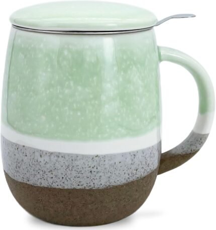 13.5 OZ Reactive Glaze Tea Infuser Cup, Loose Leaf Tea Cup with strainer and lid, Porcelain Mug with Infuser Basket for Microwave & Dishwasher Safe, Green