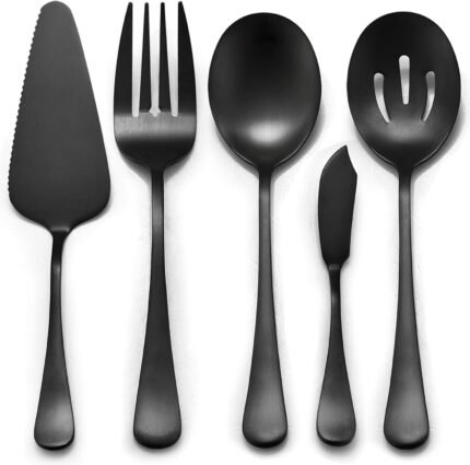 LIANYU 5-Piece Matte Black Serving Utensils Set, Stainless Steel Flatware Serving Set, Ideal for Buffet Catering Party, Satin Finish, Dishwasher Safe