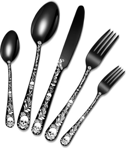 Skull Black Silverware Set for 4, Skeleton Flatware Set Halloween Silverware Set, Gothic Unique Skull Pattern Design, Black Stainless Steel Silverware, Dishwasher Safe (20, Black)