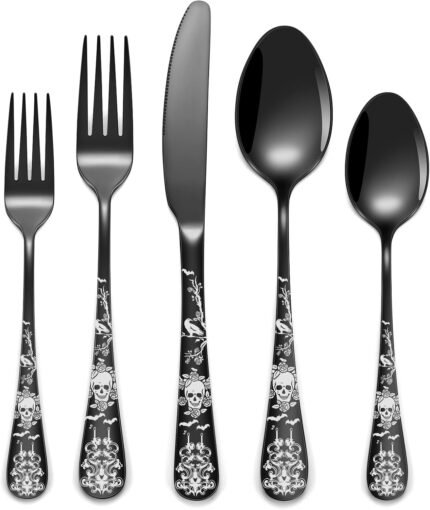 Price: (as of – Details) 40-Piece Black Skull Silverware Set for 8 This 40-piece flatware set includes 8 each of
