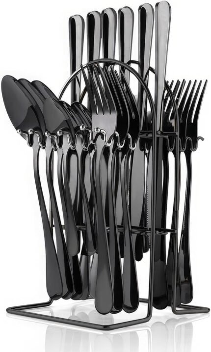 Flatware Set Rack,24 Piece Gilded Silverware Set with stand,Hanging Stainless Steel Utensils Set Service for 6,Eating Tableware Set Include Fork Knife Spoon Holder Set,Dishwasher Safe (Black)…