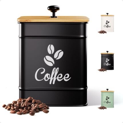 Airtight Coffee Canister – 40 oz Large Iron Black Coffee Container Airtight – 6 x 8 inch Metal Jar – Stylish Countertop Container for Coffee Grounds, Beans, Pods & More with Rubber-Lined Bamboo Lid