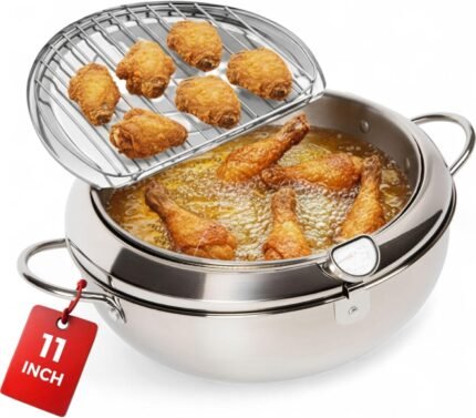Alpha Living SDF-04 Deep Fryer Pot – 11-Inch Stainless Steel Frying Pot with Oil Thermometer – Ideal for Deep Frying Chicken, Fries, Mini Donuts, Tempura & More – Frying Pan for Home Use