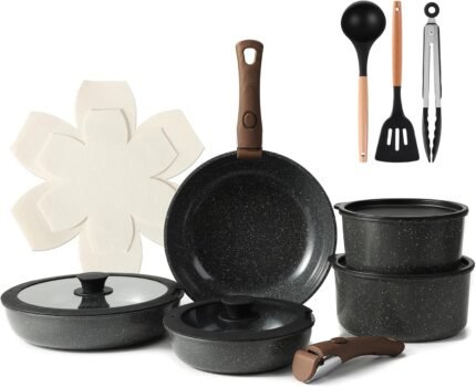 15-Piece Premium Nonstick Cookware Set – Marble Coated Pots & Pans (Interior & Exterior), Removable Handle, Space-Saving for RVs & Small Kitchens, Induction & Oven Safe, PFOA-Free