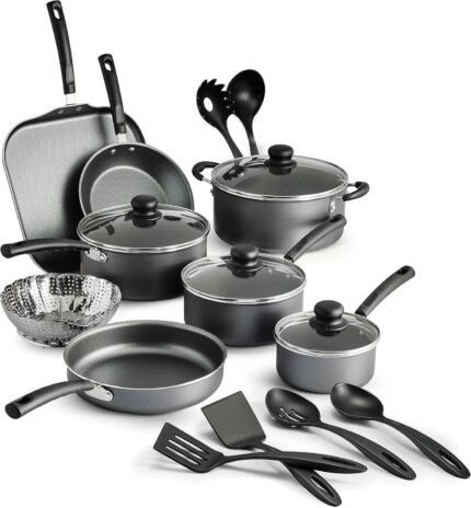 Price: (as of – Details) Features This 20-piece durable cookware set has a rich assortment, including frying pans, saucepans, a