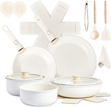 21 Piece Pots and Pans Set Non-Stick, Ceramic Cookware Set with Sensor Handles, Milky white