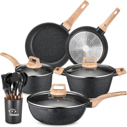 Price: (as of – Details) 17-Piece Granite Cookware Set: Ultimate Kitchen Convenience This 17-piece granite cookware set is designed to