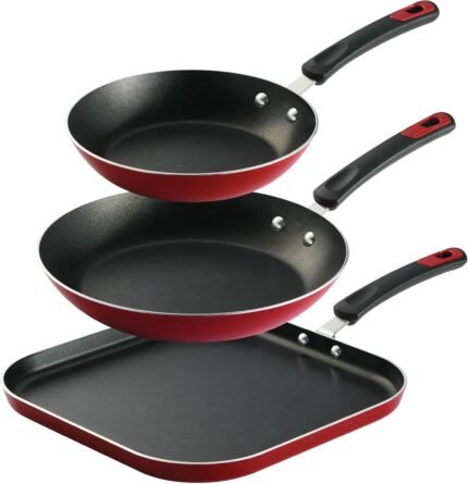 3 Pcs Aluminum Nonstick Fry Pan and Griddle Set, Easy Care Nonstick Cookware Set, Dishwasher Safe– Metallic Red