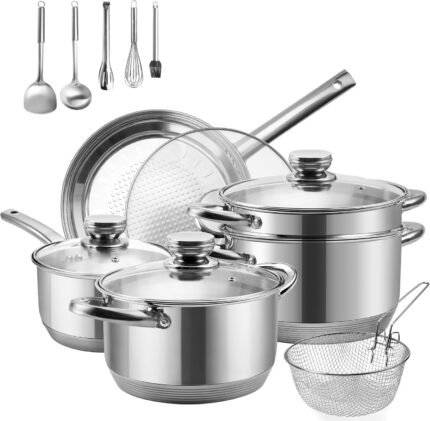 Wodillo 15-Piece Cookware Set,Stainless Steel Pots and Pans Set, Nonstick Frying Pans, Sauce pan, Food Streamer & Soup Pots with Multi-Ply Designed Bottom, Induction Compatible