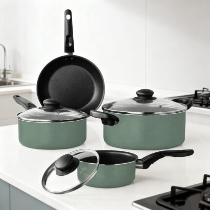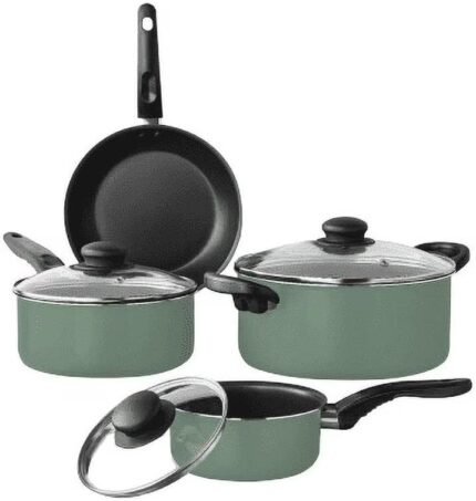 Price: (as of – Details) 7 Piece Green Sage Non-Stick Cookware Set This comprehensive cookware set is crafted from high-quality