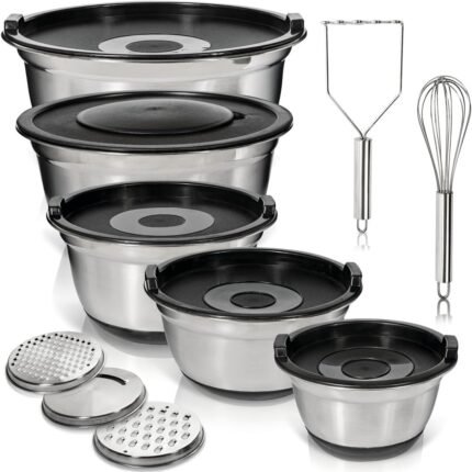 WHYSKO Stainless Steel Mixing Bowls with Lids Set – 5 Rustproof Metal Nesting Mixing Bowls for Kitchen, Meal Prep, Baking, Cooking, Storage – Includes 3 Grater Attachments, Dishwasher Safe