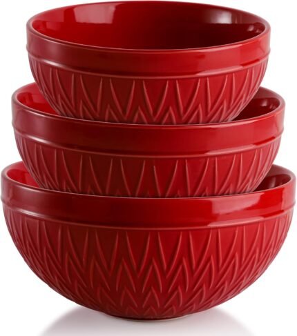 AVLA Porcelain Mixing Bowls for Kitchen, 3/1.8/1.2 Qt Ceramic Large Serving Salad Soup Bowl Set, Deep Nesting Bowl for Space Saving, 3-Piece Set, Microwave and Dishwasher Safe, Red
