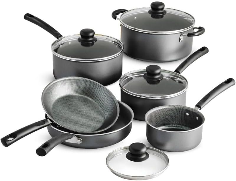 The patterned coating on the inside of this 10-piece cookware set ensures ease of use and simple cleanup, and the riveted handles stay cool. Providing all the essentials for making soups, sauces, stir-fries and more, this non-stick cookware set can be used to cook many memorable meals.