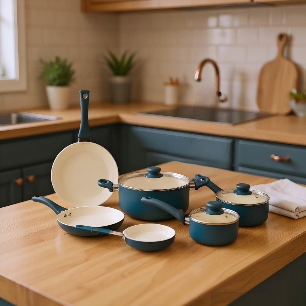 • Complete Essential Set: This set includes all the basic cookware and kitchen utensils you need for daily cooking, such as saucepans, frying pans, stock pots, and matching utensils.