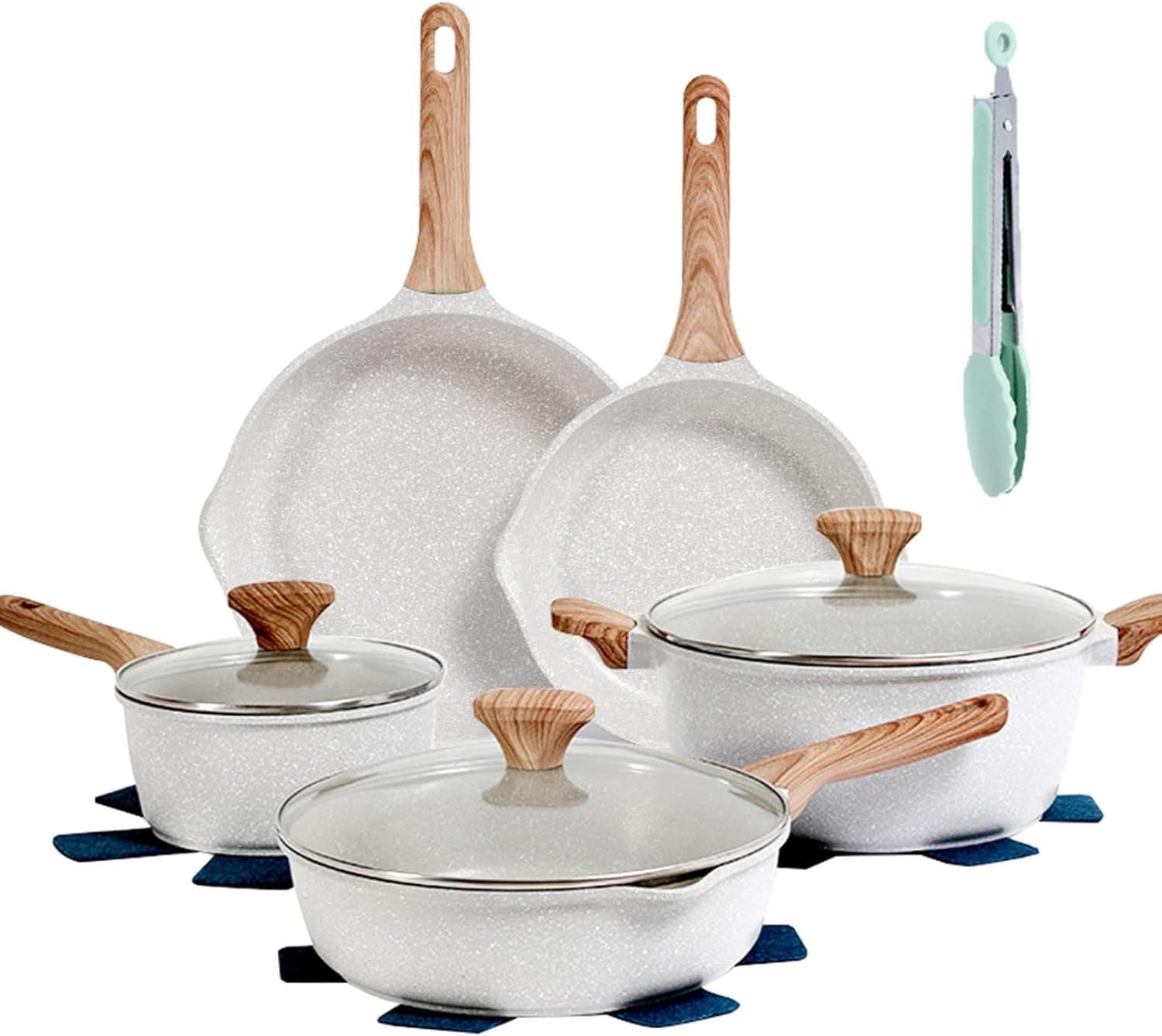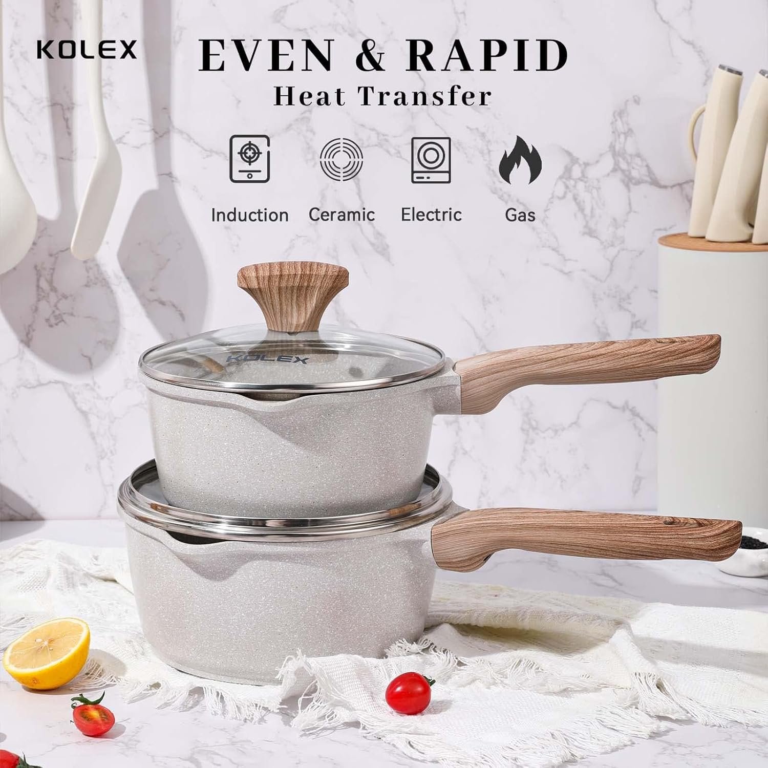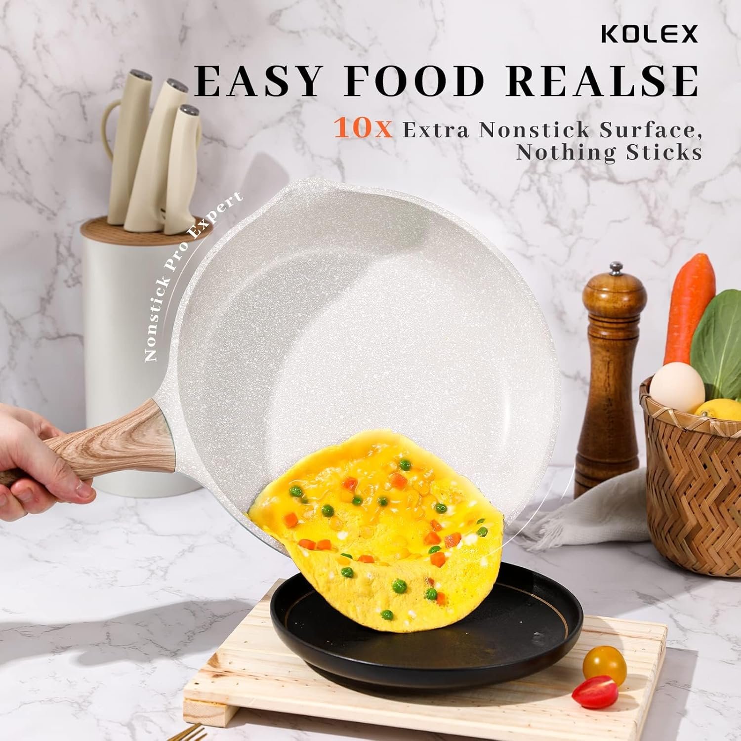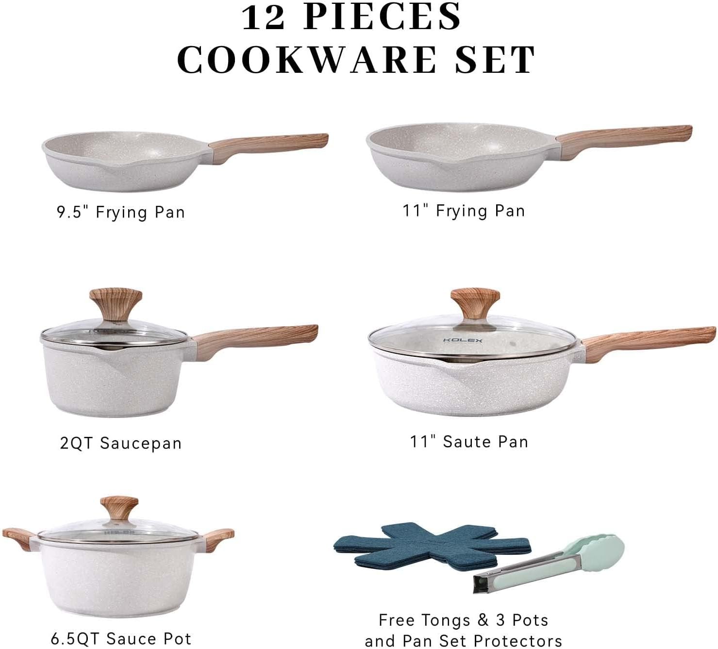 The KOLEX 12-Piece pots and pans set is a comprehensive cooking solution that includes a 9.5″ Frying Pan, 11″ Frying Pan, 11″ Wok Pan, 7-inch milk pan, 11-inch stock pot, 3 mats, and 1 steak clip. This set is designed to make cooking easy and convenient, with a non-stick coating that helps to prevent food from sticking and makes cleaning a breeze.