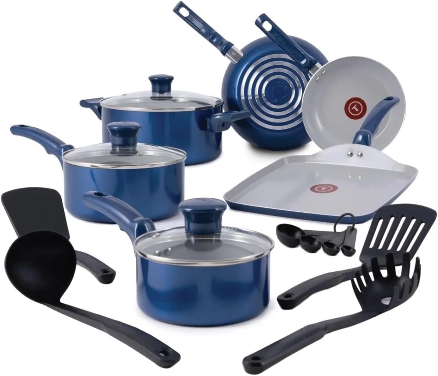 - Includes a variety of pieces: 8 Inch and 9.5 Inch Fry Pans, 10.25 Inch Square Griddle, 1 Quart Saucepan with lid, 2 Quart with lid, 5 Quart Dutch Oven with lid, set of 4 Measuring Spoons, Solid Spatula, Slotted Spatula, Pasta Fork, and Ladle