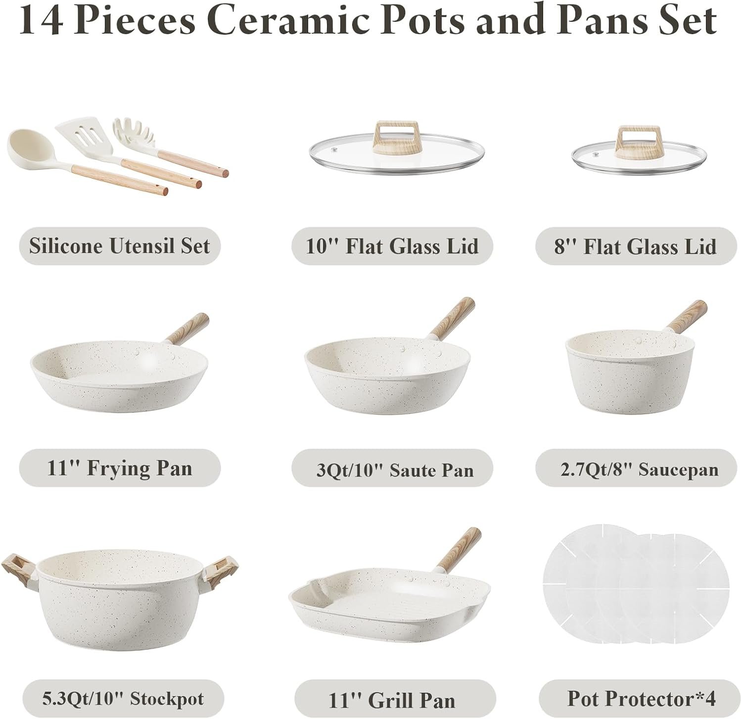 Bazova 14-Piece Ceramic Non-Stick Cookware Set is designed for healthier cooking, perfect for daily meals for families of 4-6. This cookware set features natural ceramic nonstick, setting it apart from Teflon-free cookware, which is free from harmful chemicals and heavy metals such as PFAS, PTFE, PFOA, lead, and cadmium.