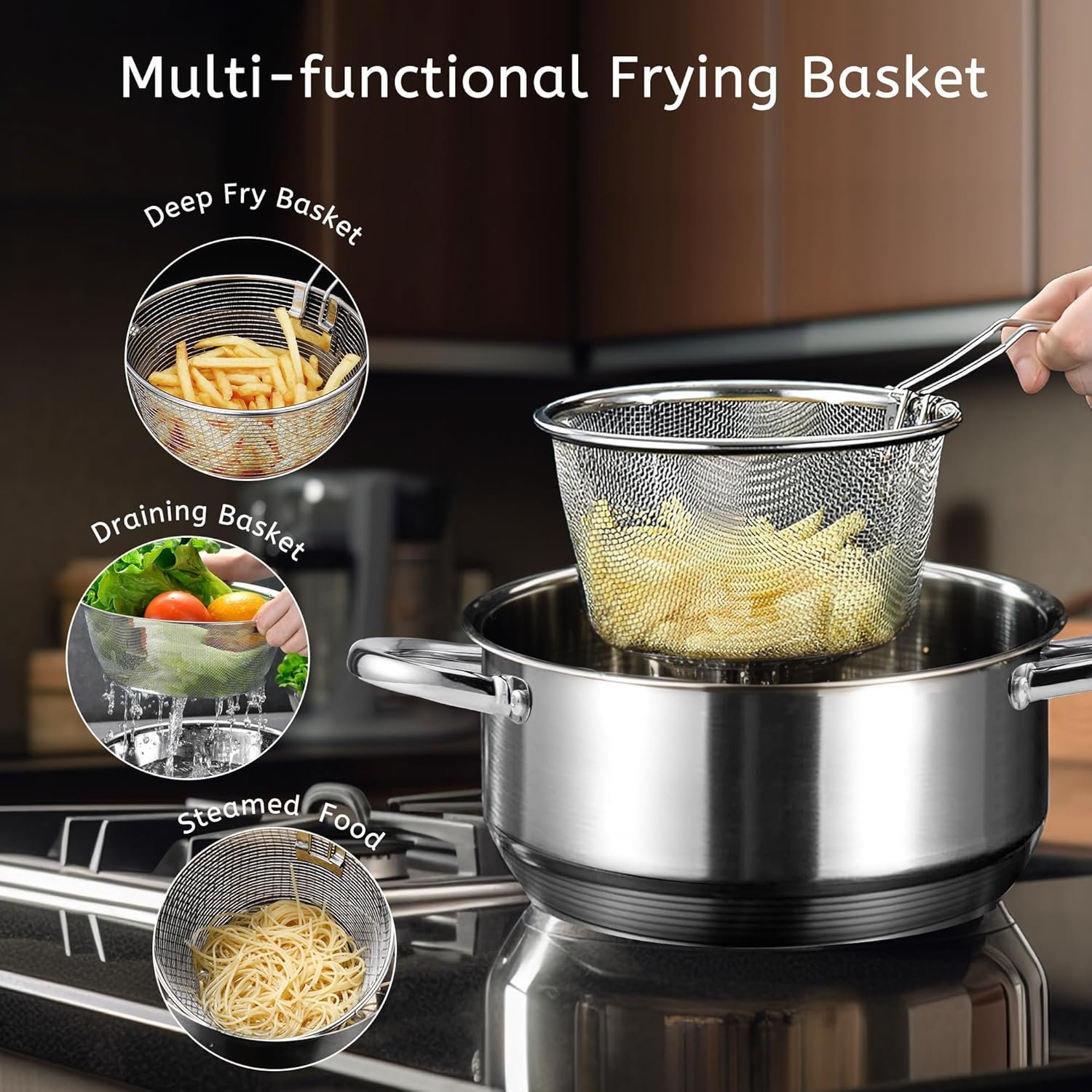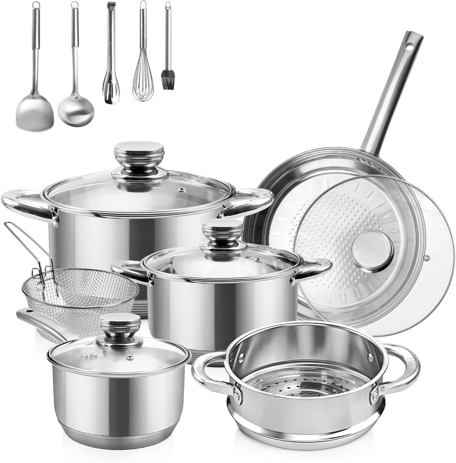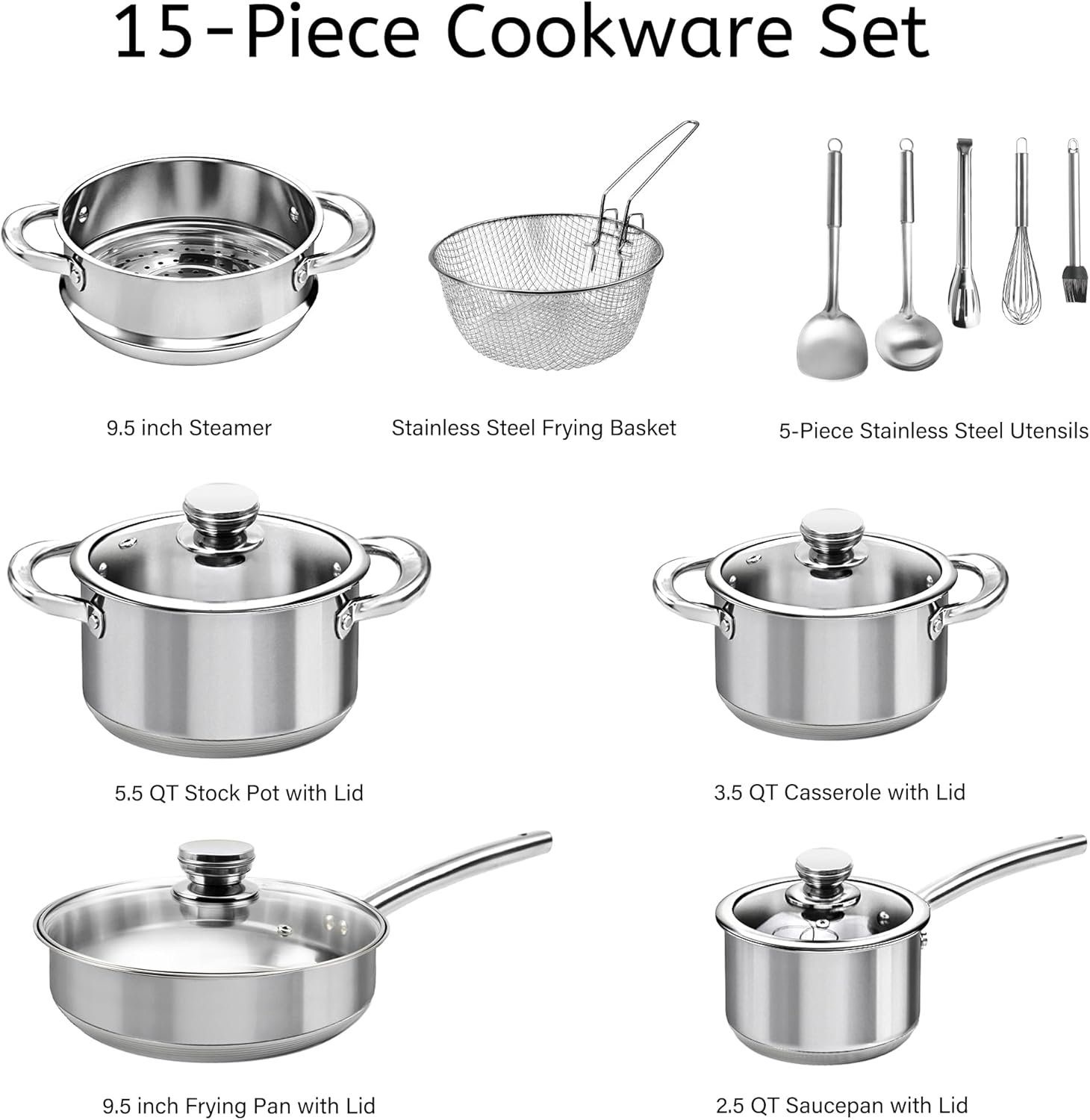 - Comprehensive Set: Includes 9.5 inch frying pan, 5.5 QT stock pot, 3.5 QT casserole, 2.5 QT saucepan, steamer, frying basket, and 5-piece stainless steel utensils.
