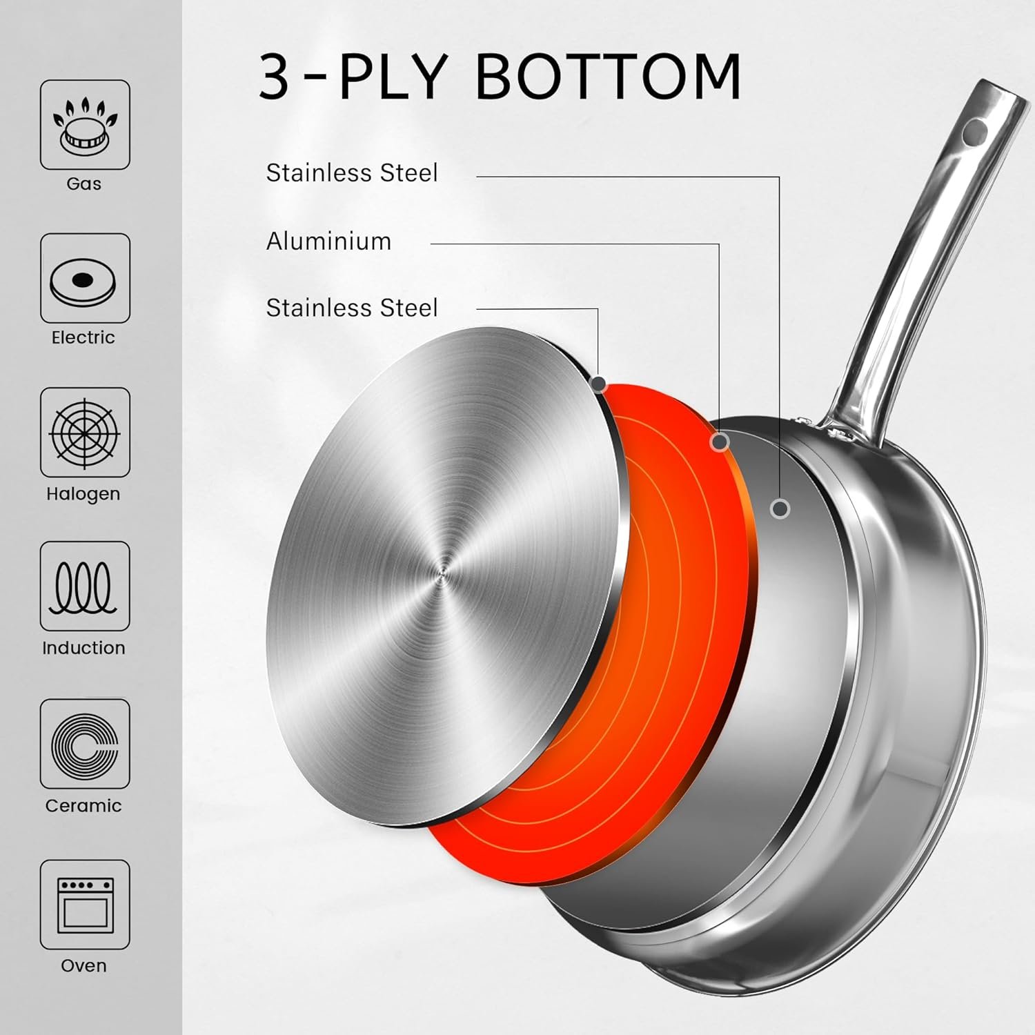 - Middle Layer: Thick aluminum core for even heating.