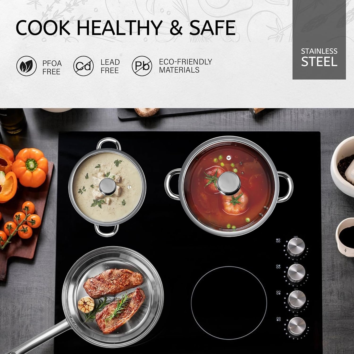 - Outer Layer: 430 stainless steel compatible with all stovetops.