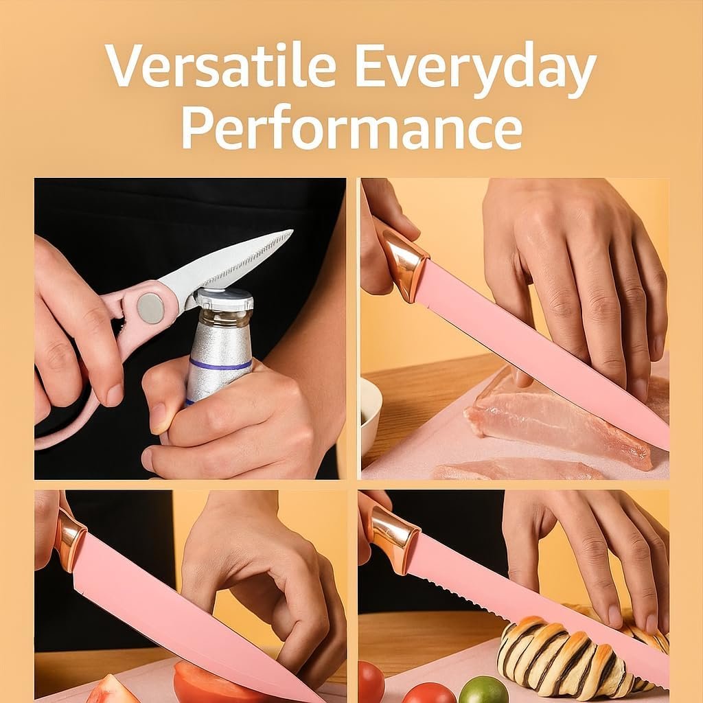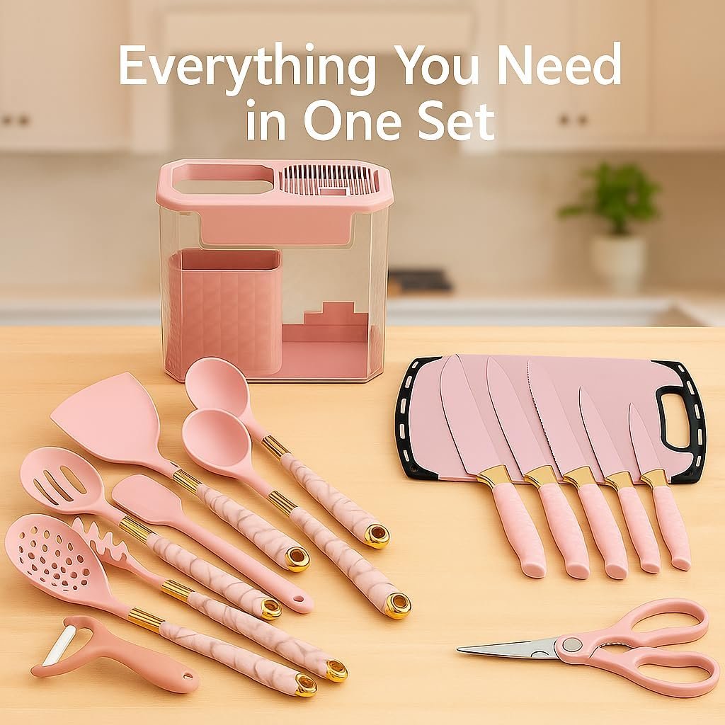 - Complete Pink Cooking Set: Includes all your essential kitchen tools — spatulas, spoons, tongs, whisk, knives, peeler, scissors, and a cutting board. Each piece is designed for versatility and daily use.