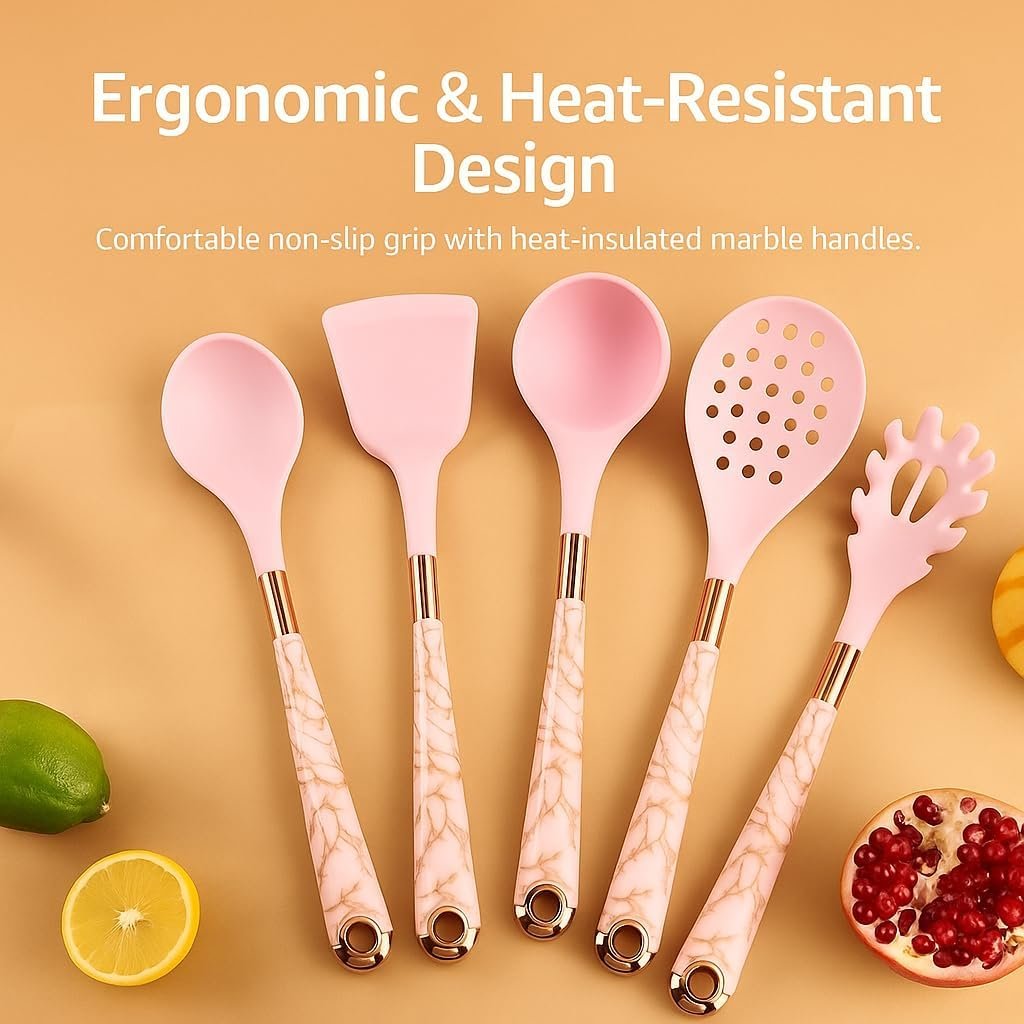The set’s chic pink marble design, complete with rose-gold accents and a transparent organizer, brings a modern and luxurious touch to any countertop. With its heat-resistant and nonstick-safe materials, this set is perfect for daily cooking, baking, and serving.