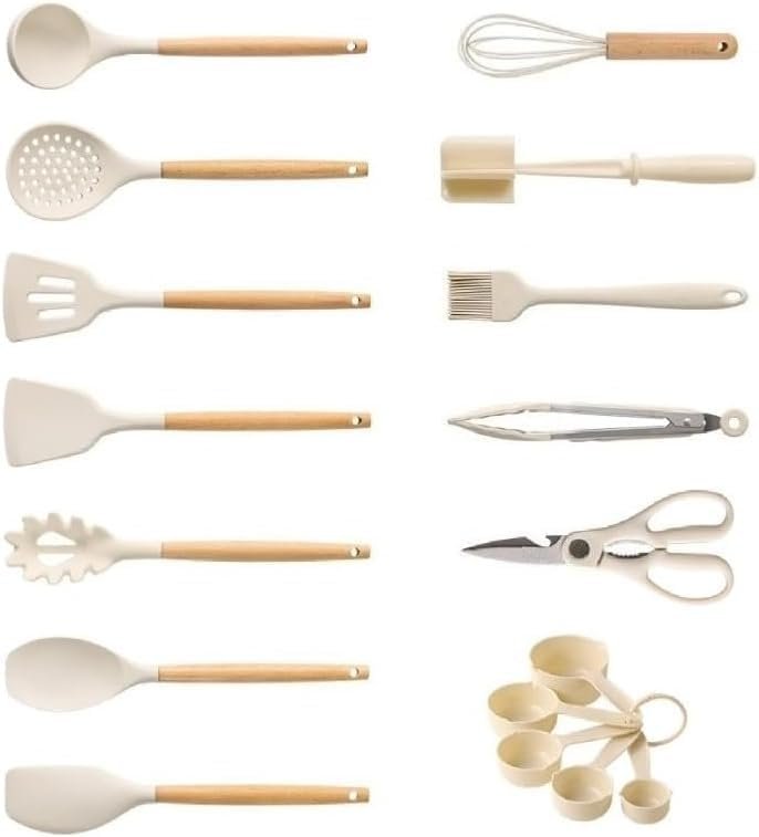 Home Cooking Utensil Sets 17-Piece Silicone and Natural Wood Cooking Utensil Set, Heat-Resistant, Safe for Nonstick Cookware