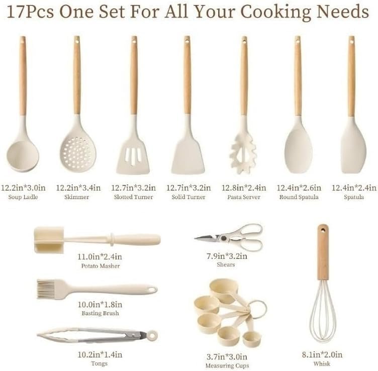17-Piece Silicone and Natural Wood Cooking Utensil Set, Heat-Resistant, Safe for Nonstick Cookware