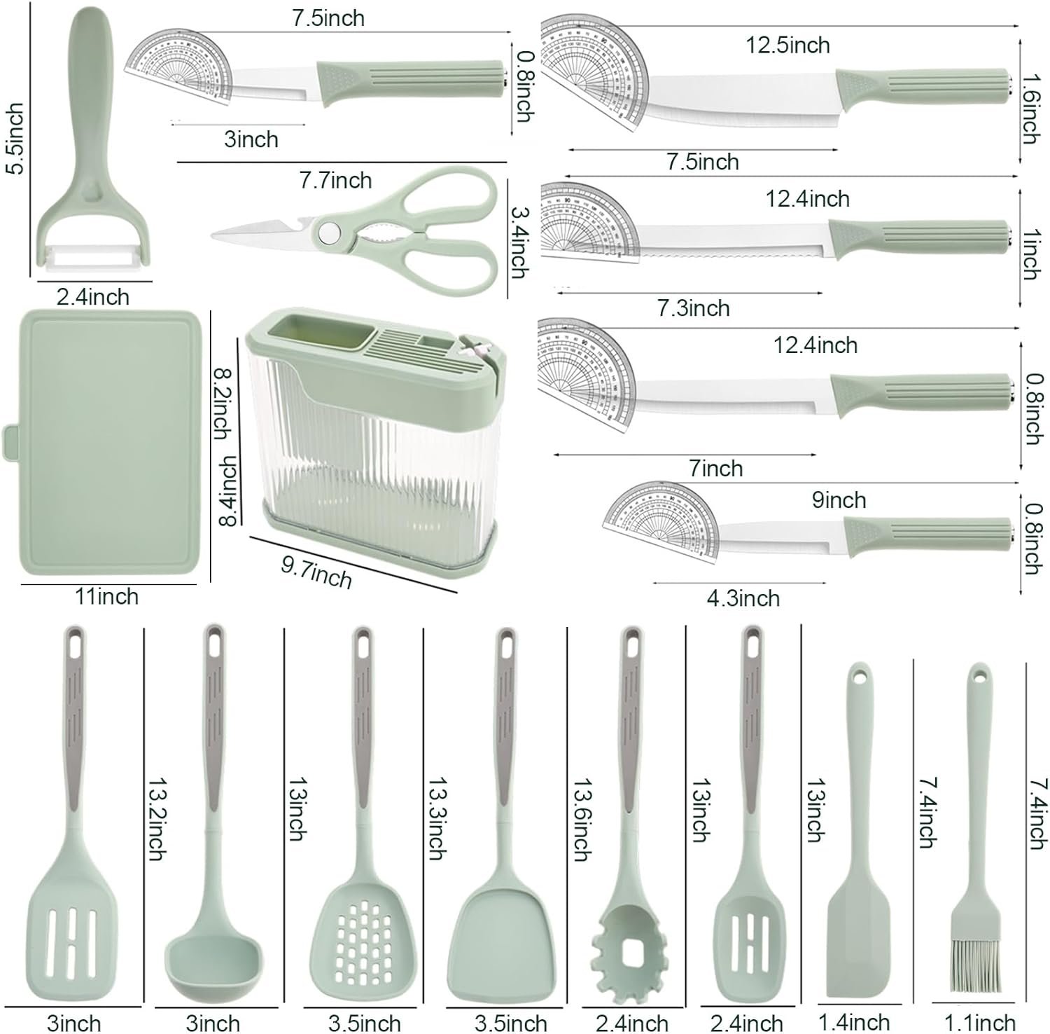 - 17-piece set includes 5 knives, 8 cooking utensils, and 4 kitchen gadgets
