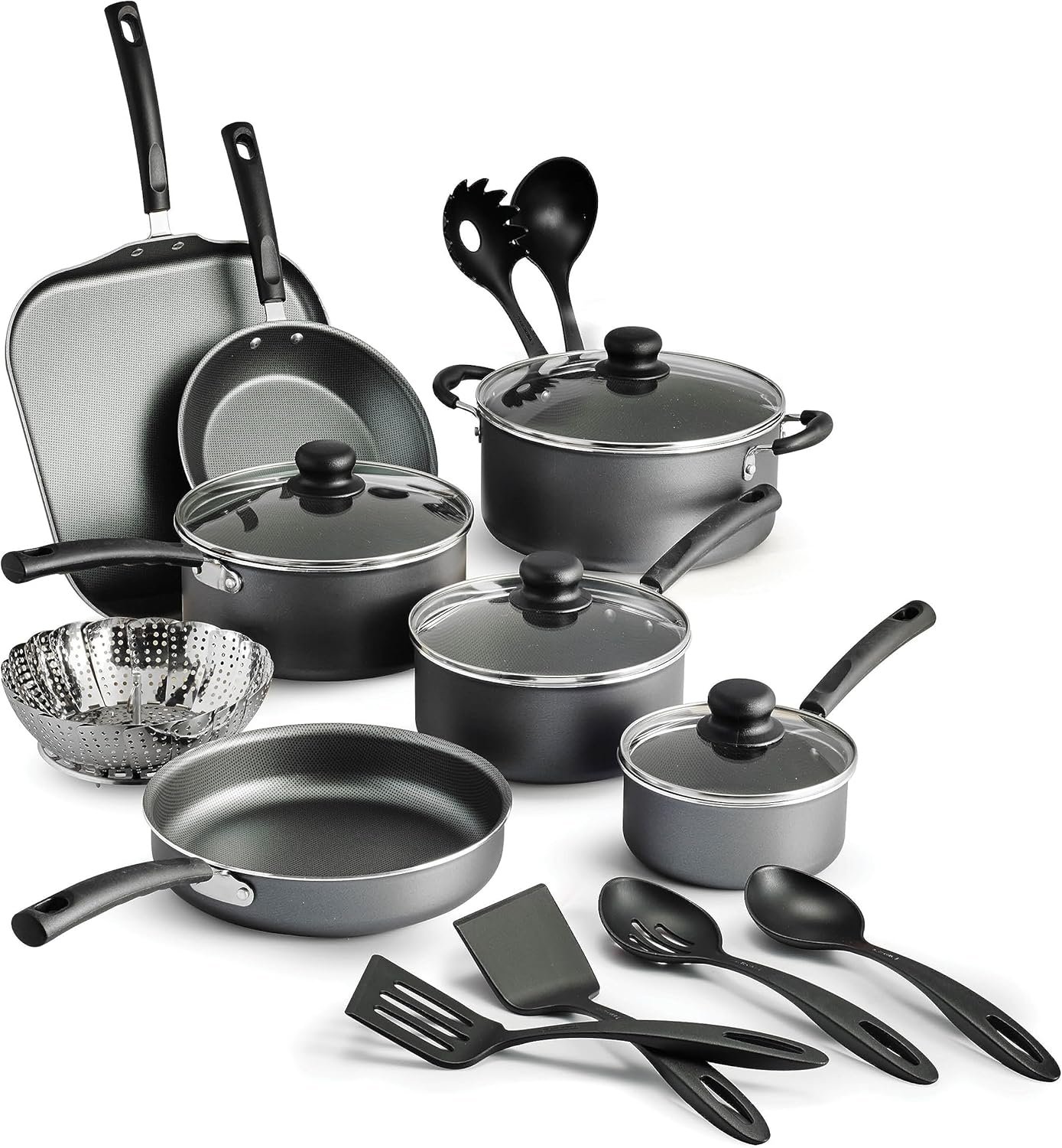 This 18-piece set includes everything you need for daily cooking, from sautéing to boiling, frying to steaming. The set includes:
